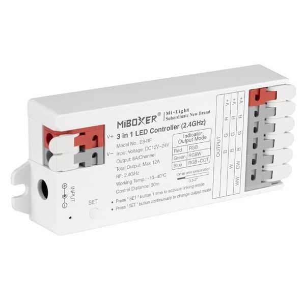 Ricevitore dimmer nano 3ch/4ch/5ch - innesto rapido - rgb/rgbw/rgb+cct con memoria 12-24vdc - max 12a - 2.4ghz - ripetizione automatica - compatibile con telecomandi milight (app/ amazon alexa e google assistant tramite modulo wifi av4300xiaa) - garanzia 2 anni - e3-rf
