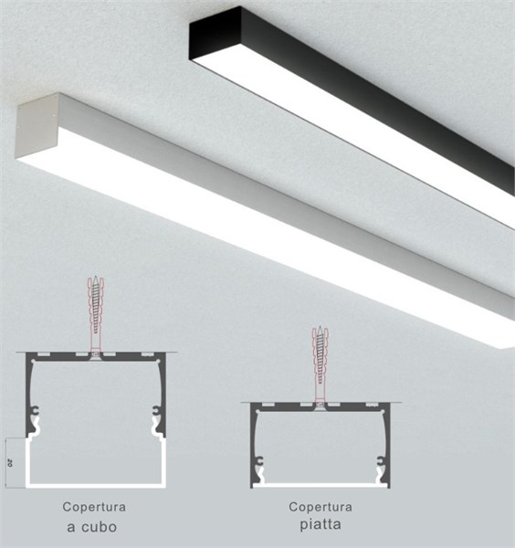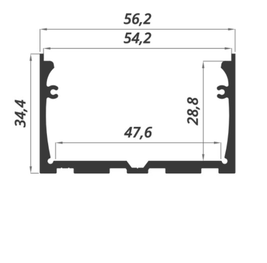 Profilo in alluminio da appoggio 56,2x34,4x2000mm - per strip larghezza max 45mm - dissipazione max. 50w/mt - cover av0155xiaf - tappi av0126xiaf/av0127xiaf - clip av0128xiaf - ordine minimo 10 pezzi