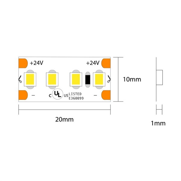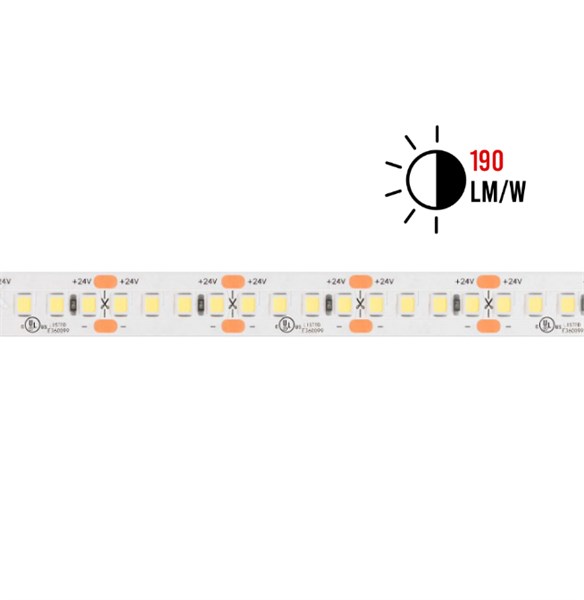 Strip led flex 200led/mt 2835 ip20 warm 3000k 24w/mt 24v 4590lm/mt (190lm/w) cri>80 5000x10mm - biadesivo 3m - garanzia 3 anni